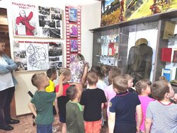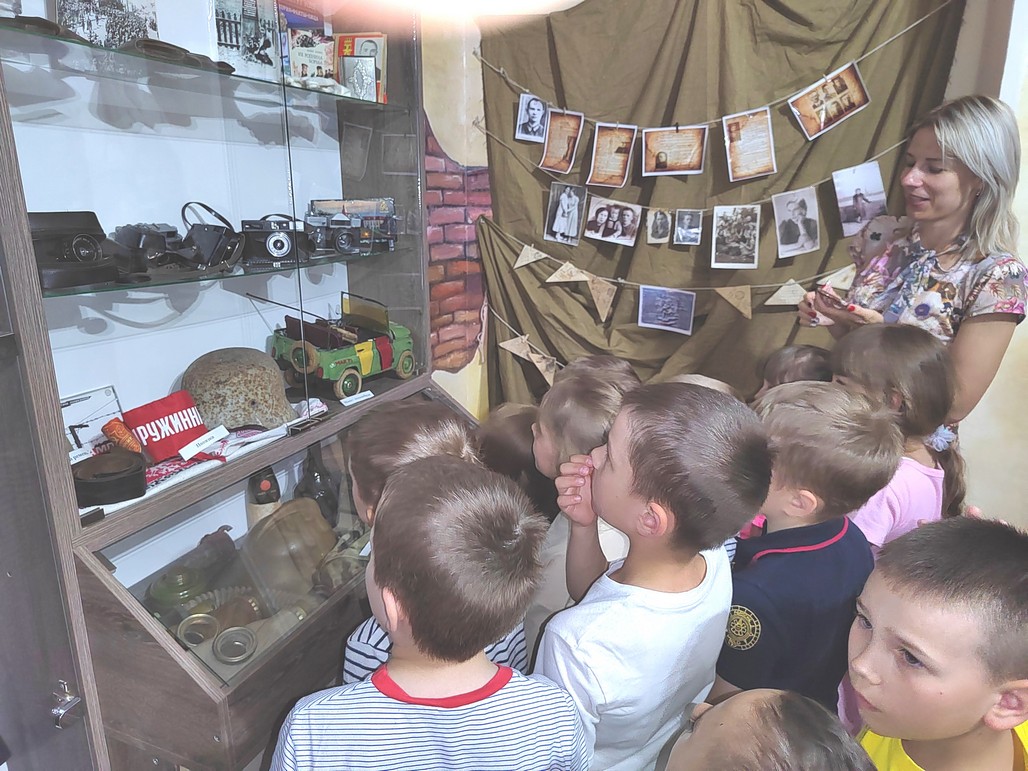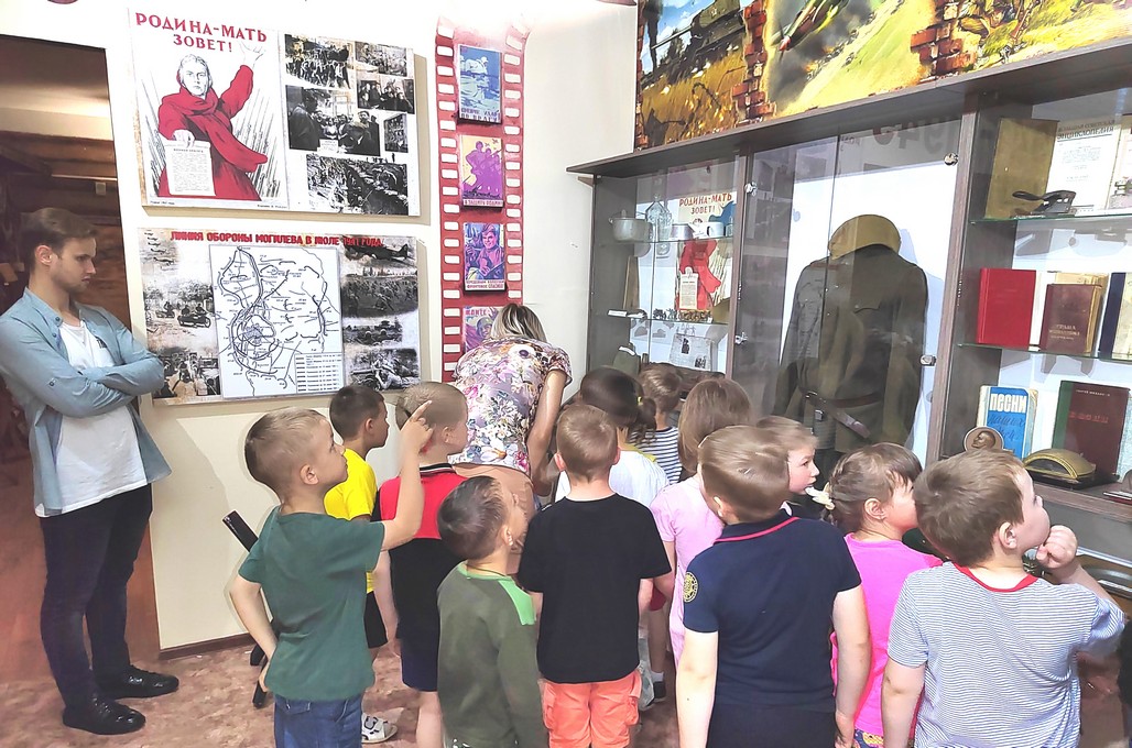 Воспитатель дошкольного образования Максимова О.Л. вместе с воспитанниками посетили историко-краеведческий музей «Спадчына» государственного учреждения образования «Средняя школа № 35 г. Могилева», где узнали много интересного о событиях Великой Отечественной Войны. Воспитанники с большим интересом слушали учителя-экскурсовода, задавали вопросы, рассматривая экспонаты: каски, фляжки, шинель, личные вещи участников войны. Также гостям были представлены стенды с фотографиями, документами, биографиями, письмами, книгами.