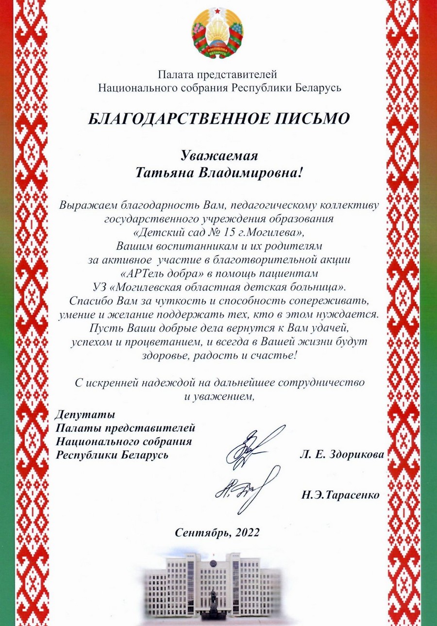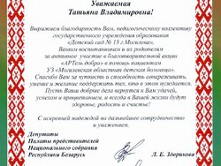 По итогам благотворительной акции учреждение дошкольного образования получило благодарственное письмо Палаты представителей Национального собрания Республики Беларусь.